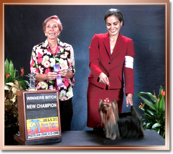 Not two days after we sent BG’s registration in as Bricriu’s Baby Girl we said we should have named her BAD GIRL! Everything from tearing up toys and climbing shelves to tear up old Yorkie Books to digging holes three times the size she was, were only half of BG’s antics as a young puppy. But we love her anyways. She is our first dog we have finished soley from the Bred-By class. Go BG!