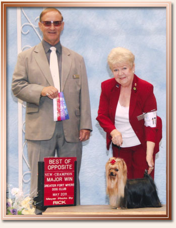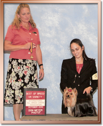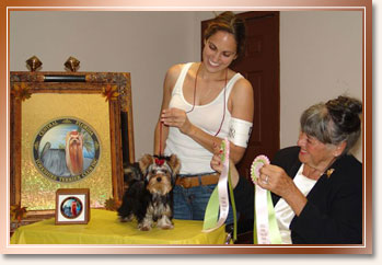 Gabby is a full sister to Nicholas and DIgger. In the spring of 2010 we nearly lost our girl to a Coral Snake Bite on her tail. By the grace of God, Gabby survived . Slowly but surely Gabby recovered and soon itched to get back out in the ring. With a lot of TLC, hard work and a nice cosey pillow in bed with her Auntie Barbara, Gabby took to the road and went right on to finish her AKC Championship at BBU becoming our first homebred champion bitch.