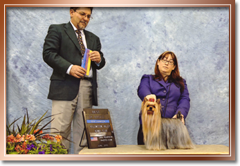 Ronan is a Patrick and Gabby son that we co-own with Deborah Brais. He has a hilarious temperament, is a natural prankster, and a loving boy who keeps us in stitches doing the Michael Jackson Moonwalk. He is so talented he can even go around corners backwards! We kept Ronan back to cultivate that fantastic coat he inherited from Patrick until he turned 3 and with Gabby's lively love to show attitude we knew he would do well. We look forward to seing him follow in Daddy's footsteps with a Grand Championship and more!